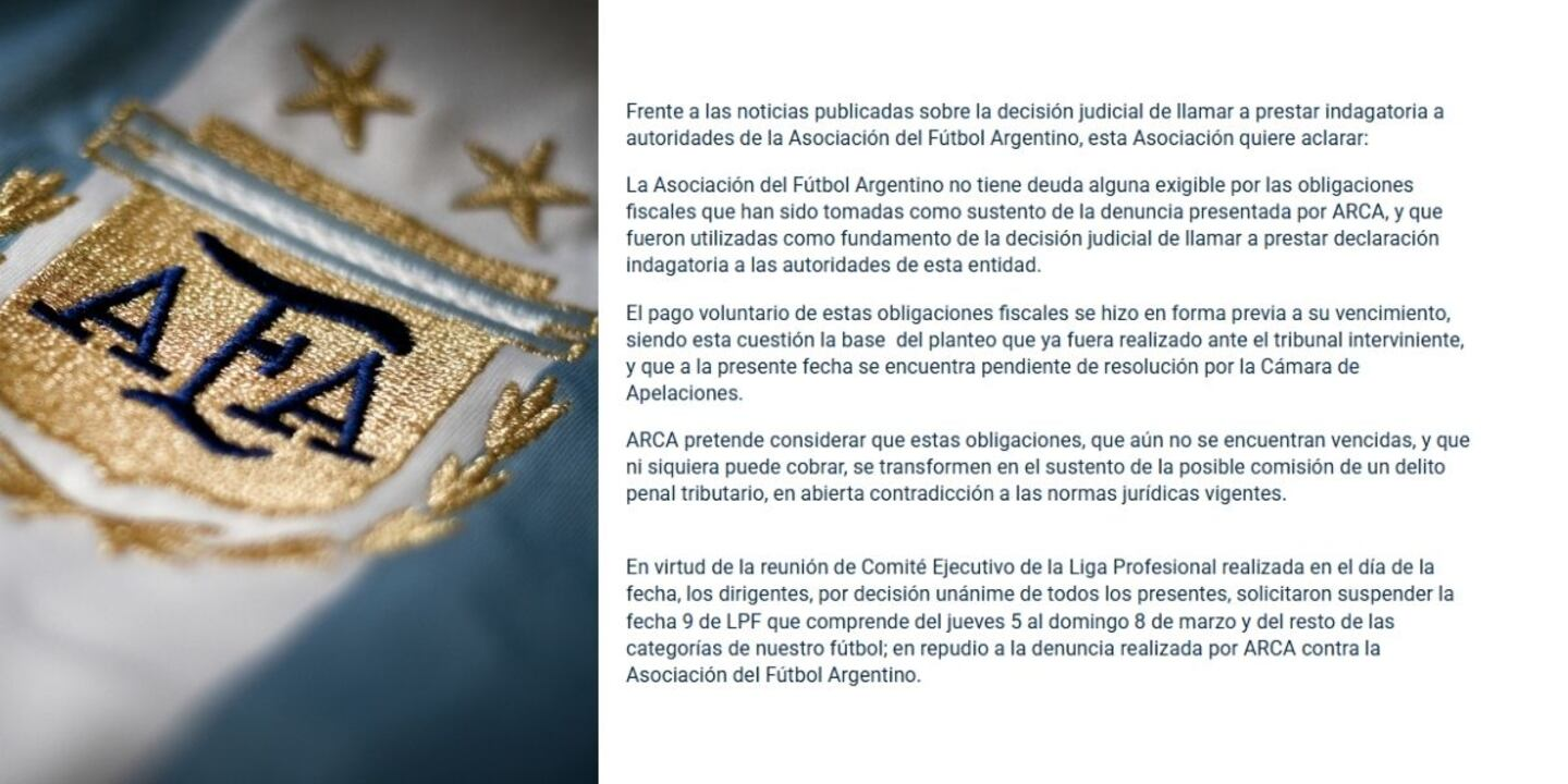 La AFA suspende la fecha 9 del fútbol argentino tras el conflicto con ARCA: qué comunicó la entidad