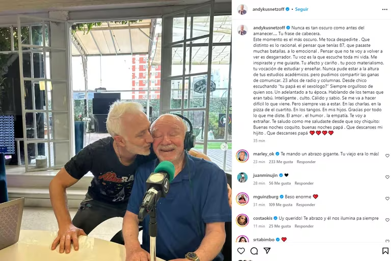 Este domingo, Andy Kusnetzoff informó que su padre falleció a sus 87 años. El periodista le dedicó un conmovedor posteo el sexólogo Juan Carlos Kusnetzoff, donde lo despide recordando lo fuerte de su vínculo y confesó cómo atraviesa este doloroso momento personal.