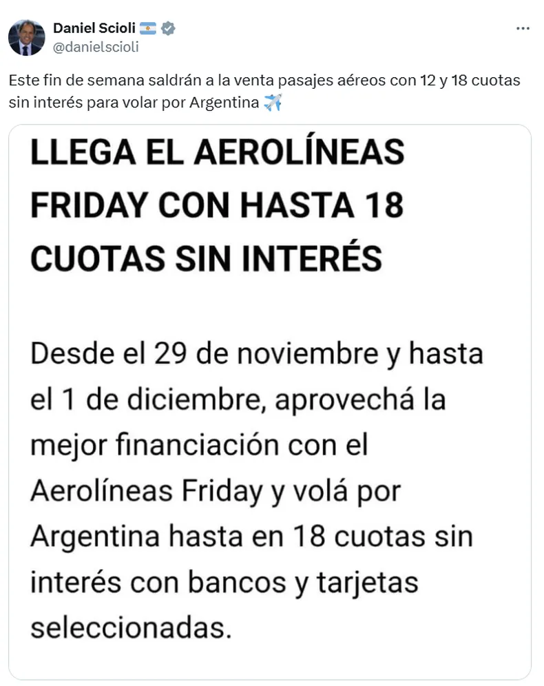 La empresa de bandera tendrá ofertas especiales en vuelos dentro del país con pasajes aéreos con 13 y 18 cuotas sin interés: “Este fin de semana saldrán a la venta pasajes aéreos con 12 y 18 cuotas sin interés para volar por Argentina”, remarcó Daniel Scioli en X.