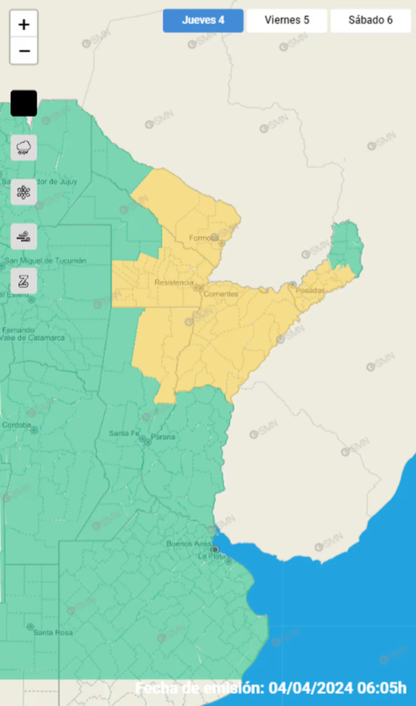 El Servicio Meteorológico Nacional emitió una alerta amarilla por tormentas y granizo para las siguientes provincias de la Argentina: Chaco; Corrientes; Formosa; Santa Fe; Misiones.