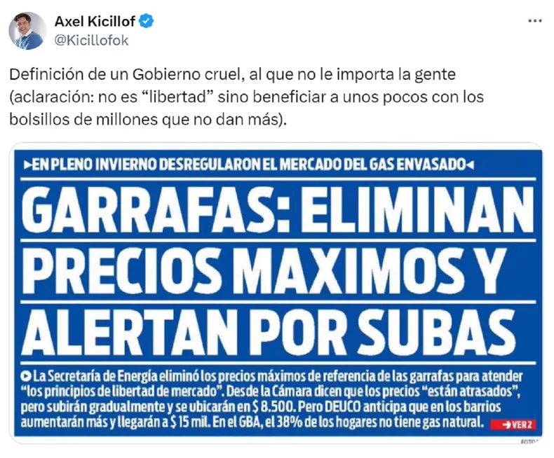 En una publicación en su cuenta de la red social X (ex Twitter), Kicillof cuestionó a la administración de La Libertad Avanza, después que la Secretaría de Energía eliminara los precios máximos de referencia de las garrafas de gas, con una desregulación de los valores de la industria. “Definición de un Gobierno cruel, al que no le importa la gente”, enfatizó.