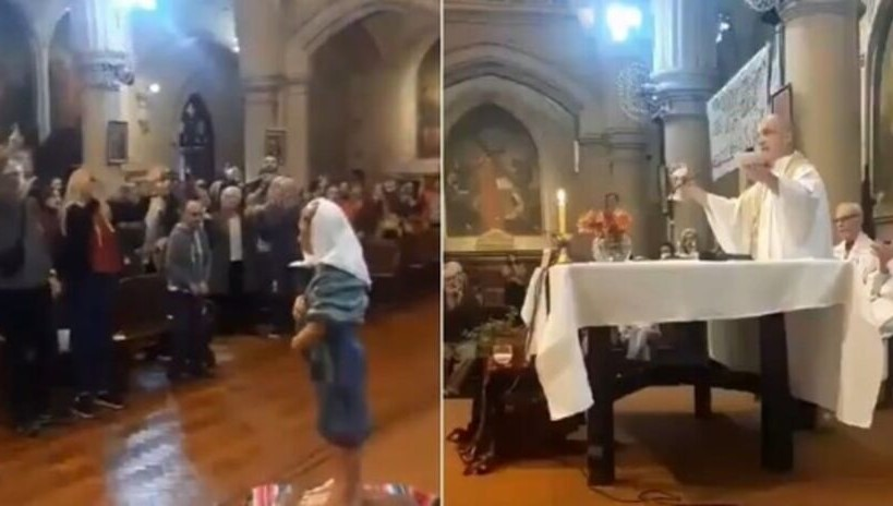 En medio de una misa en la Iglesia de la Santa Cruz, en el barrio porteño de San Cristóbal, hubo cantos y consignas contra el presidente Javier Milei.
