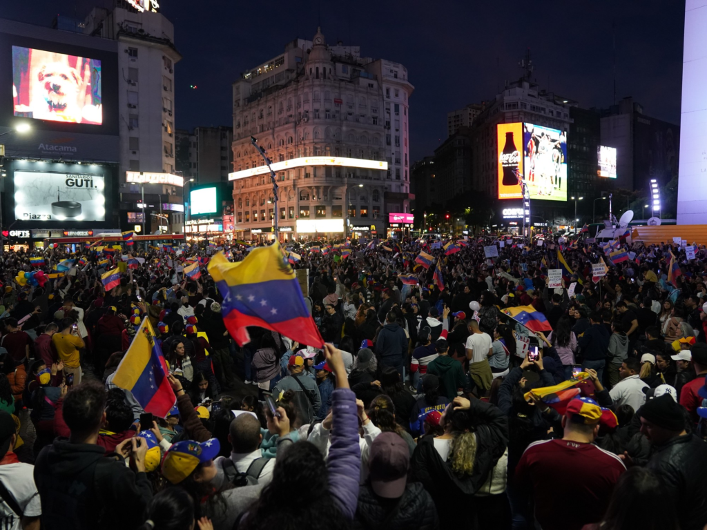 Alrededor de 10.000 de manifestantes se agolparon alrededor del Obelisco de Buenos Aires enarbolando banderas venezolanas y portando carteles que piden “Venezuela libre”, “basta de dictadura”, “justicia y libertad”, “nadie dijo que sería fácil” o “prohibido rendirse”.