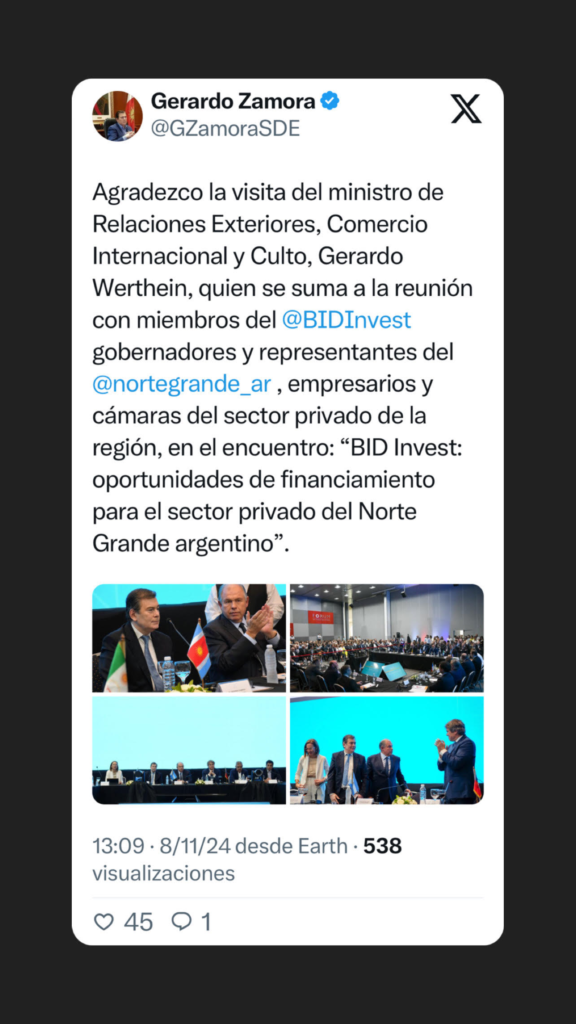 En su mensaje en redes sociales, el mandatario destacó la relevancia de esta reunión para la región, y agradeció la disposición del ministro Werthein y los miembros de BID Invest para colaborar en el fortalecimiento de las capacidades económicas y la generación de nuevas oportunidades de inversión para las provincias del norte.