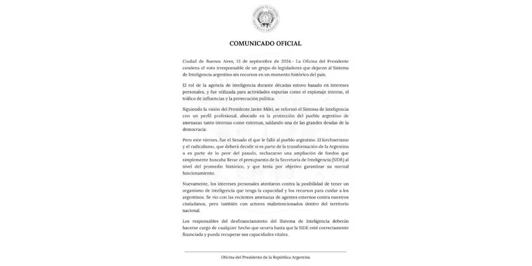 “La Oficina del Presidente condena el voto irresponsable de un grupo de legisladores que dejaron al Sistema de Inteligencia argentino sin recursos en un momento histórico del país.