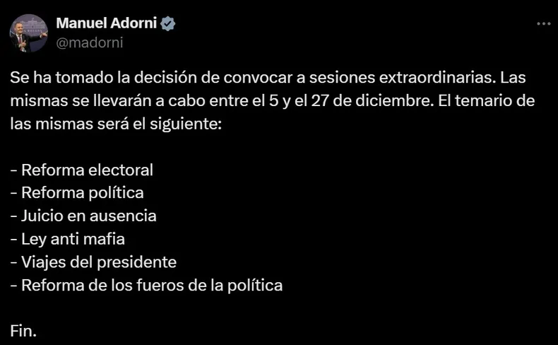 El anuncio fue realizado por el vocero presidencial, Manuel Adorni, en su cuenta de la red social X. El temario incluye la reforma electoral, la reforma política, el juicio en ausencia, la Ley antimafia, los viajes del Presidente y la reforma de los fueros de la política.