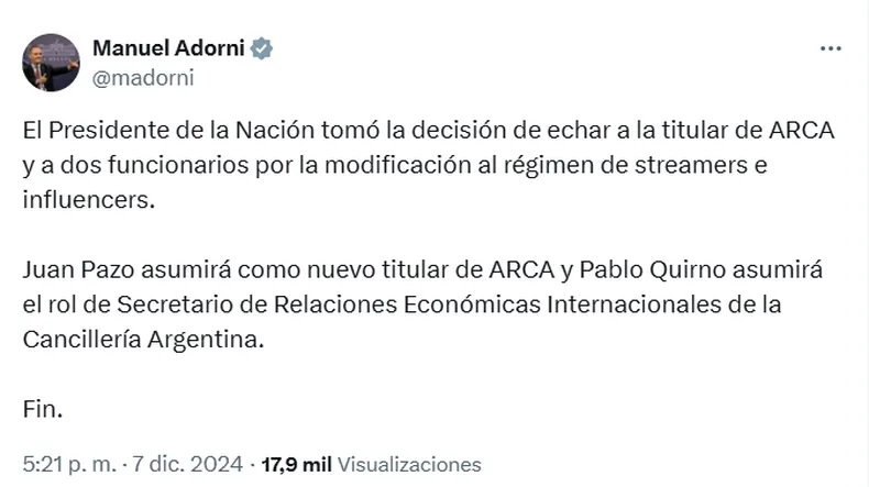 El vocero presidencial, Manuel Adorni, precisó el sábado que el mandatario tomó la decisión de echar a Misrahi y a otros dos funcionarios “por la modificación al régimen de streamers e influencers“.