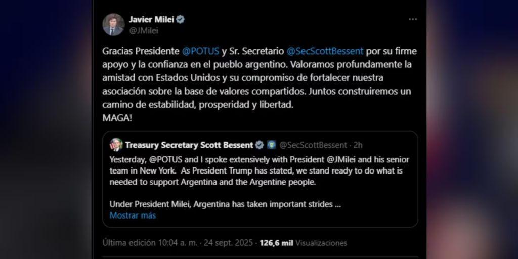 Por su lado, el ministro de Economía, Luís Caputo, también expresó: “Bueno, qué se puede agregar más que thank you Secretary @SecScottBessent. Argentinos, empieza una nueva era. A trabajar todos juntos para hacer nuestro país grande nuevamente”.