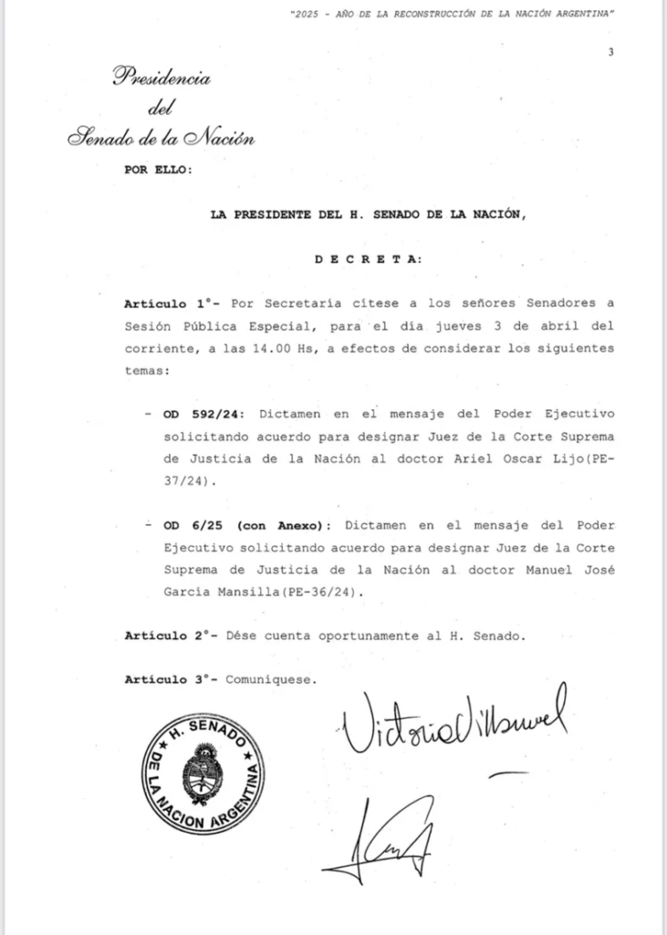 La presidenta del Senado, Victoria Villarruel, convocó este jueves a una sesión especial para el jueves 3 de abril, a las 14, en la que el cuerpo deberá tratar los pliegos de los jueces Ariel Lijo y Manuel García Mansilla, postulados por el Poder Ejecutivo para integrar la Corte Suprema de Justicia.