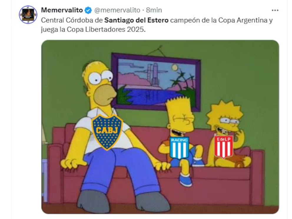 Con este resultado, Central Córdoba celebró un logro significativo en su historia futbolística y también sacó el pasaje a la Copa Libertadores 2025, lo que provocó que Independiente se quedara sin chances y que Boca Juniors tampoco pueda confirmar su asistencia en el certamen. Esto fue motivo de burla en las redes sociales, donde catarata de memes. A continuación, los más divertidos.