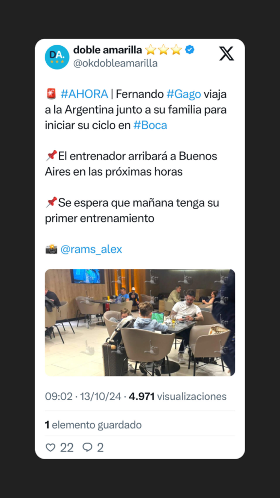 A su vez, se espera que Gago, ya establecido en Buenos Aires, sea presentado oficialmente ante los medios como nuevo coordinador del primer equipo este mismo lunes, para así poner en marcha el ciclo sucesivo al interinato de Mariano Herrón.