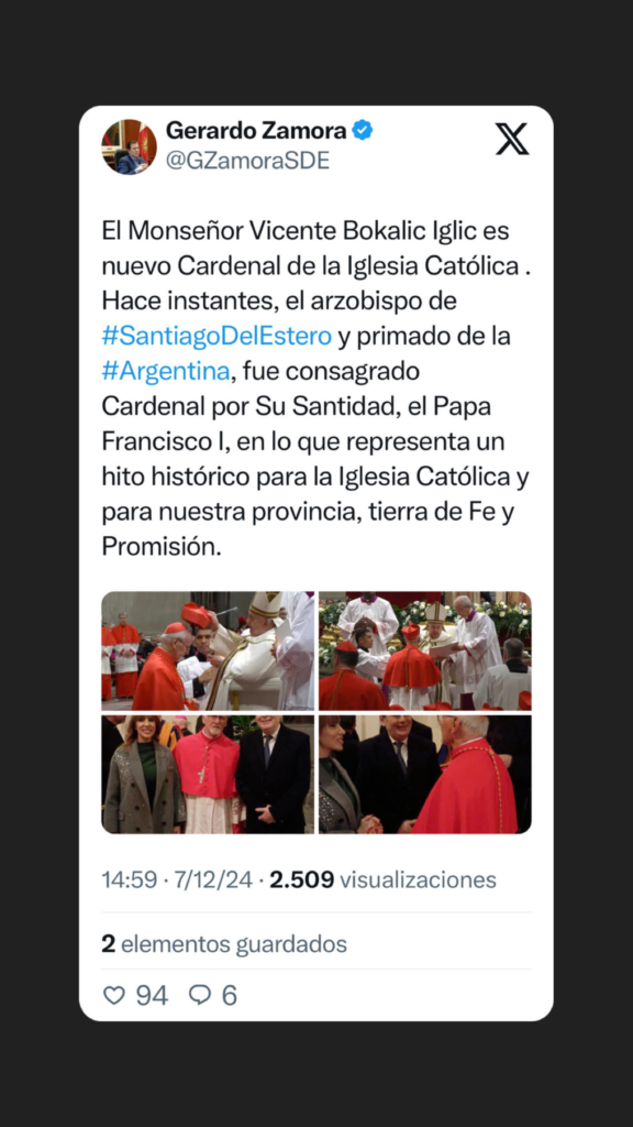 El gobernador de Santiago del Estero, Dr. Gerardo Zamora, se expresó a través de las redes sociales, sobre la histórica consagración de monseñor Vicente Bokalic como cardenal.