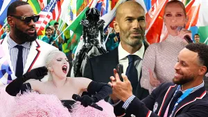 En el clip inicial participó el Gran Zinedine Zidane, partícipe de un recorrido por las calles y el metro de París para hacer llegar la antorcha al Sena, donde se desarrolló el gran desfile. Desde una plataforma especial se presentó a Emmanuel Macron y Thomas Bach, presidente de Francia y el Comité Olímpico Internacional, respectivamente.