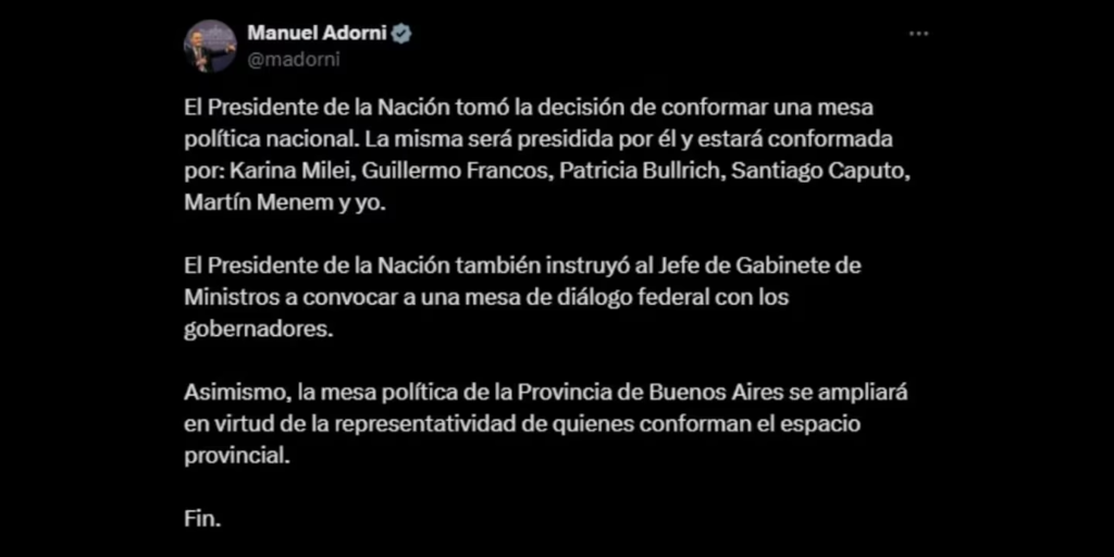 Tras la derrota en las elecciones en Buenos Aires, El vocero presidencial, Manuel Adorni, anunció este lunes a través de sus redes sociales la conformación de una mesa política nacional que estará encabezada por el propio Presidente y que reunirá a figuras centrales del Gobierno y del espacio oficialista. La decisión, que incluye además la convocatoria a una mesa de diálogo federal con los gobernadores y la ampliación de la mesa política en la Provincia de Buenos Aires, marca un nuevo movimiento en la estrategia política de la gestión.