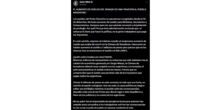 A través de sus redes sociales, Javier Milei criticó el aumento de la dieta de los senadores y fue contundente con su mensaje.