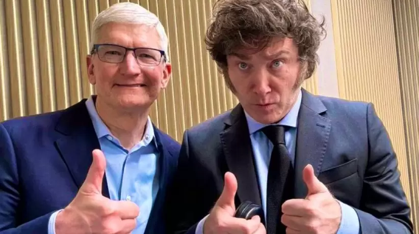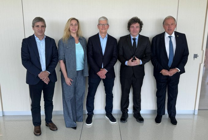 En un día histórico en cuanto a las vinculaciones de empresas de tecnología con la Argentina, el presidente Javier Milei visitó al CEO de Apple, Tim Cook. En la foto dada a conocer por la oficina presidencial se puede ver al ministro de Economía Luis Caputo, junto a Karina Milei y al embajador de Argentina en los Estados Unidos Gerardo Werthein.