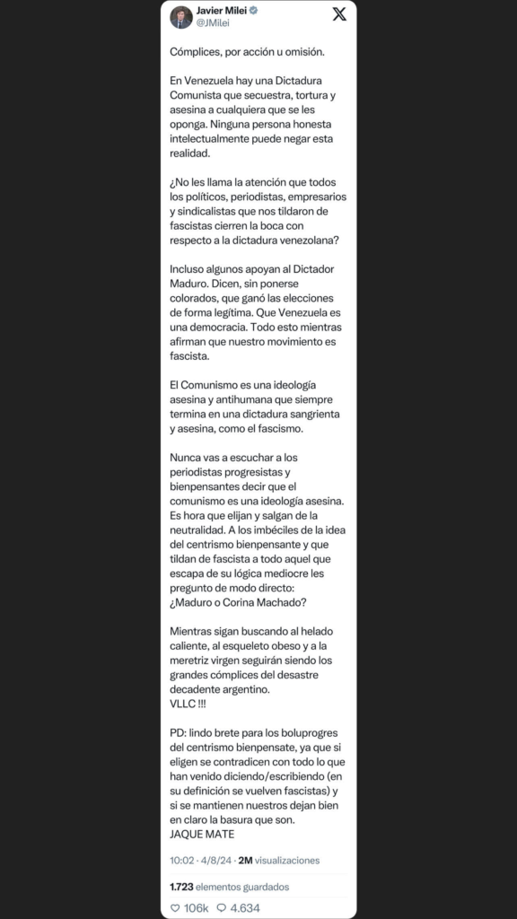 Ante la irregularidad en los comicios electorales, se renovaron las críticas de Javier Milei, quien publicó un extenso mensaje en las redes sociales, no sólo contra Maduro sino también contra quienes lo respaldan, que tituló: “Cómplices, por acción u omisión”.