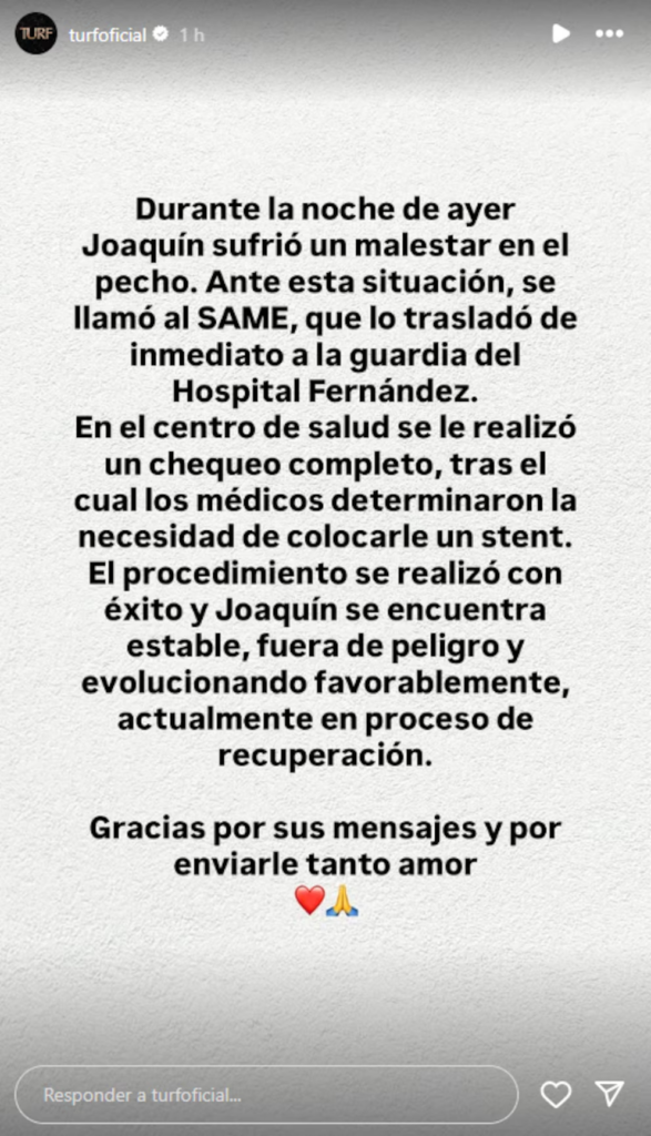 Horas más tarde, la banda emitió un comunicado oficial sobre el estado de salud de su líder: “Durante la noche de ayer, Joaquín Levinton sufrió un malestar en el pecho, ante esta situación, se llamó al SAME, que lo trasladó de inmediato a la guardia del Hospital Fernández”, informó el texto publicado en el Instagram de la banda.