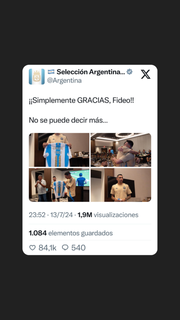 “Gracias Fideo”, dice en la espalda la camiseta argentina con un 11 dorado que le fue entrada por parte de Messi y de parte de todo el equipo argentino.