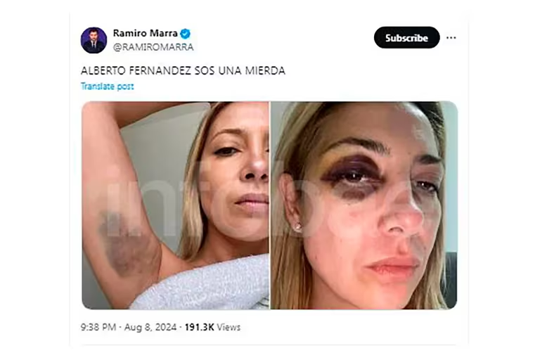 El referente de la Coalición Cívica, Maximiliano Ferraro, también enumeró una serie de calificativos, exteriorizando su impacto por las imágenes de Fabiola Yañez con marcas en su cuerpo y en uno de sus ojos. “Deplorable. Vergonzoso. Decadente”, indicó el dirigente del espacio político que lidera Elisa Carrió.