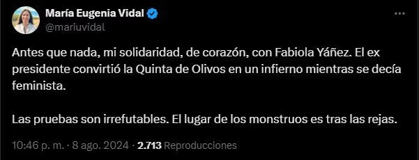 “Mi solidaridad, de corazón, con Fabiola Yáñez. El ex presidente convirtió la Quinta de Olivos en un infierno mientras se decía feminista. Las pruebas son irrefutables. El lugar de los monstruos es tras las rejas”, expresó Vidal.