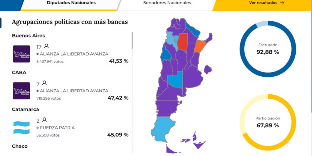 - Buenos Aires: La Libertad Avanza 17 – Fuerza Patria 16 – FRENTE DE IZQUIERDA Y DE TRABAJADORES – UNIDAD 2.