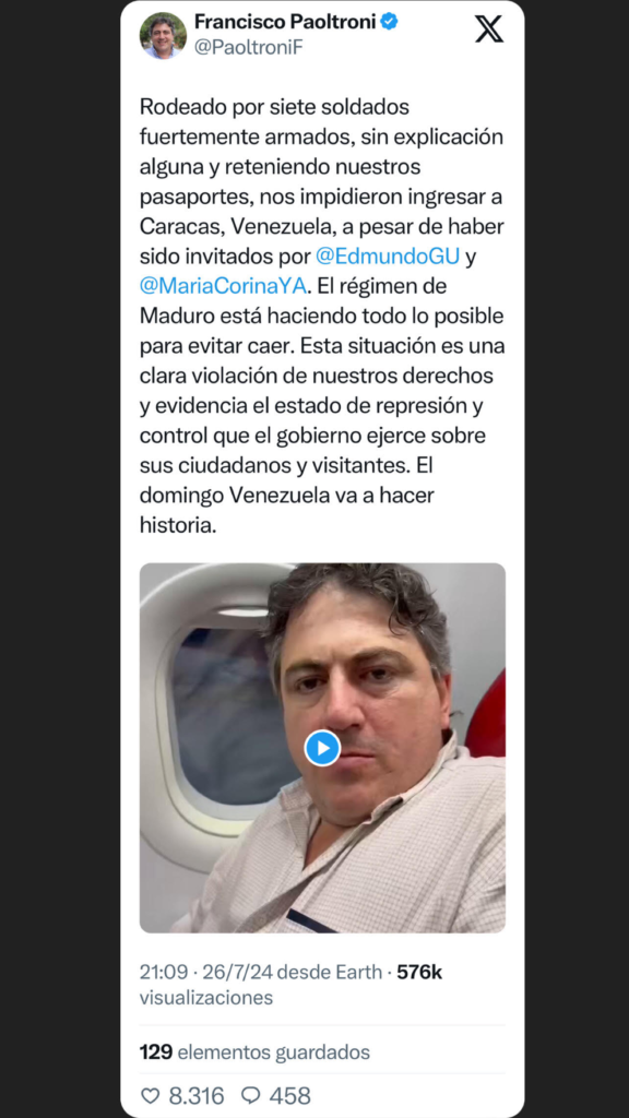 El senador de La Libertad Avanza Francisco Paoltroni (Formosa) se sumó a la lista de veedores internacionales y periodistas deportados por el Gobierno venezolano. A menos de 36 horas de la elección que podría cambiar el color político en Venezuela, el gobierno chavista deportó a una gran cantidad de dirigentes y periodistas que participarían de la elección de este domingo como veedores internacionales.
