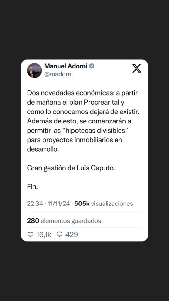 Adorni, a través de su cuenta de X, anunció la decisión del Ejecutivo este lunes por la noche. “Dos novedades económicas: a partir de mañana el plan Procrear tal y como lo conocemos, dejará de existir”, escribió.