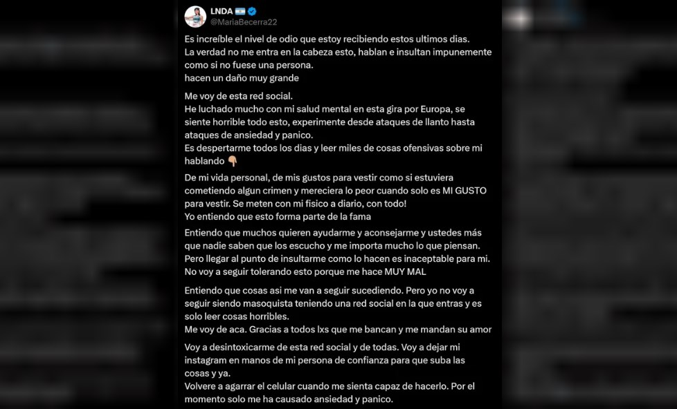 “Me voy de esta red social”, comenzó el hilo de X y detalló su decisión: “He luchado mucho con mi salud mental en esta gira por Europa, se siente horrible todo esto, experimente desde ataques de llanto hasta ataques de ansiedad y pánico”.