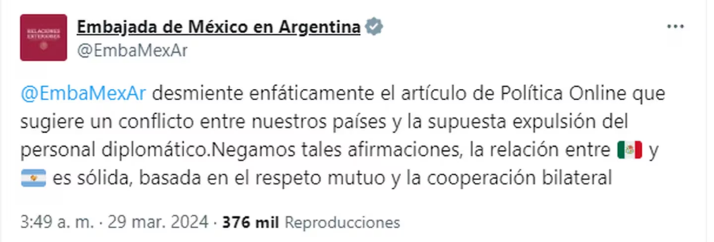 La desmentida de la Embajada de México en Argentina. (Foto: X @EmbaMexAr)