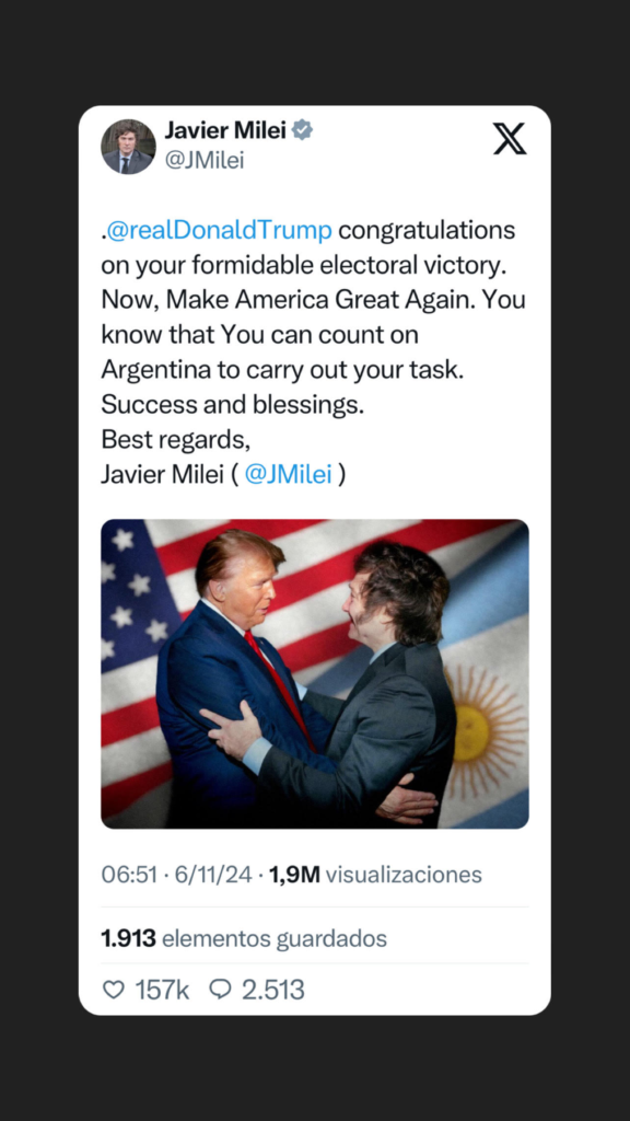 Milei agregó: “Ahora, make America great again. Saben que pueden contar con Argentina para llevar a cabo su tarea. Éxitos y Bendiciones. Atentamente, Javier Milei”.