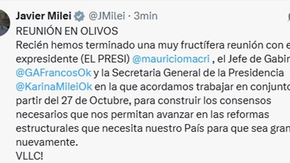 Tras en encuentro, el presidente compartió un mensaje en su cuenta de la red social X: “Recién hemos terminado una muy fructífera reunión con el expresidente (EL PRESI) Mauricio Macri, el Jefe de Gabinete Guillermo Francos y la Secretaria General de la Presidencia, Karina Milei, en la que acordamos trabajar en conjunto, a partir del 27 de Octubre, para construir los consensos necesarios que nos permitan avanzar en las reformas estructurales que necesita nuestro País para que sea grande nuevamente. VLLC!”.