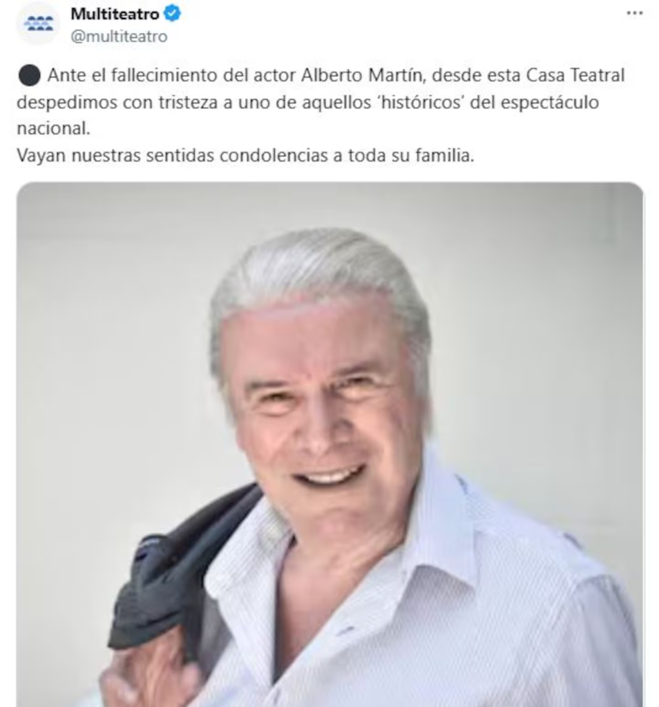 La triste noticia fue confirmada por Carlos Rottemberg a través de la cuenta oficial de X del Multiteatro: “Ante el fallecimiento del actor Alberto Martín, desde esta Casa Teatral despedimos con tristeza a uno de aquellos ‘históricos’ del espectáculo nacional. Vayan nuestras sentidas condolencias a toda su familia”.