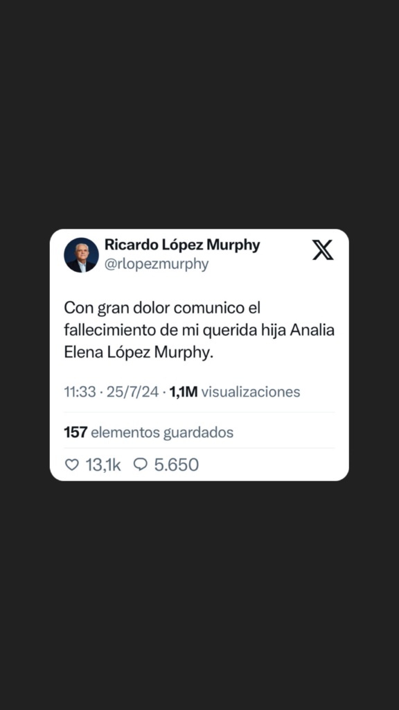 El diputado nacional Ricardo López Murphy comunicó la noticia de la muerte de su hija Analía Elena a través de su cuenta en la red social X. “Con gran dolor comunico el fallecimiento de mi querida hija Analía Elena López Murphy”, expresó.