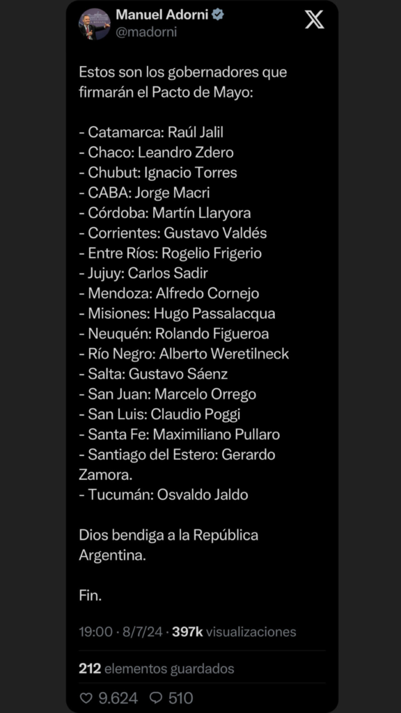 El gobierno nacional confirmó esta tarde la lista de gobernadores que firmarán junto al presidente Javier Milei el Pacto de Mayo, en la provincia de Tucumán, durante la celebración por el día de la Independencia. Lo hizo oficial el vocero presidencial Manuel Adorni, con un mensaje en su cuenta de X.