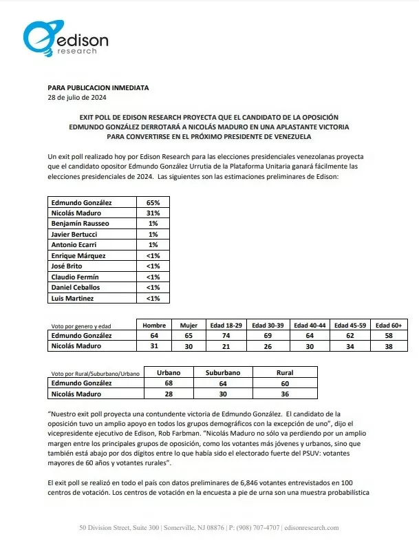 Otro análisis difundido fue el de Edison Research, el cual proyecta una contundente victoria para la oposición con un 65% de los votos frente a un 31% para el oficialismo. Este “exit poll”, basado en entrevistas con 6,846 votantes en 100 centros de votación, ofrece un análisis detallado de la distribución del voto por género, edad y ubicación geográfica.