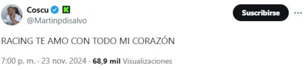 El reconocido streamer y youtuber Martín Pérez Disalvo, mejor conocido como Coscu, publicó en su cuenta oficial de X: “Racing, te amo con todo mi corazón”. “Costas se lo merece tanto. Cómo vas a sentir tanto el escudo, hermano. Te amo, viejito. Quédate 3 años más. Te bancaste que te puteen siendo mas hincha que todos. Y nos sacaste campeones. Quédate a vivir ahí, narigón hermoso”, añadió.