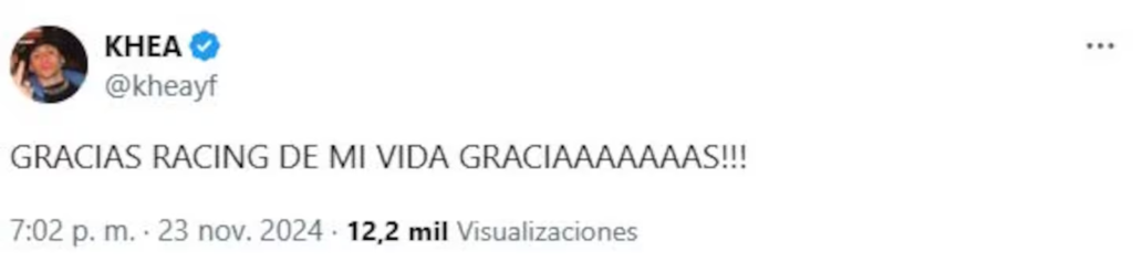 El trapero Khea celebró en X el tercer título internacional de su equipo. “Gracias Racing de mi vida. Gracias”, escribió eufórico el autor de Loca.