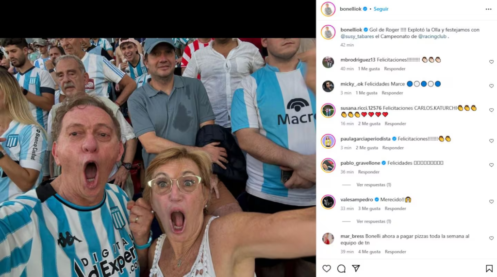 El periodista de TN Marcelo Bonelli estuvo presente en La Nueva Olla y se sacó una selfie celebrando la victoria con su esposa Susana Tabares. “¡¡¡¡Gol de Roger!!!! Explotó la Olla y festejamos el campeonato de Racing”, lanzó.