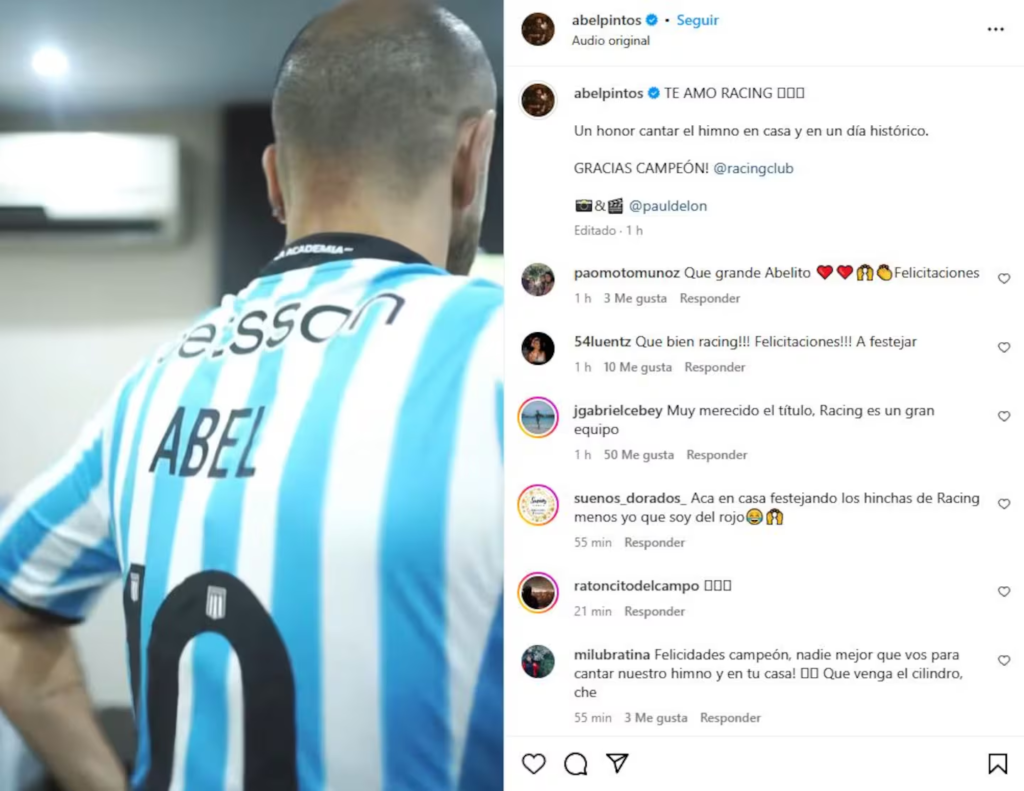 “Te amo, Racing. Un honor cantar el himno en casa y en un día histórico ¡Gracias campeón!”, escribió Abel Pintos junto a un video de su presentación en El Cilindro, donde cantó el himno nacional argentino para los hinchas antes de que comenzara la final.