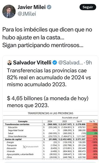 Buen día a todos los comprovincianos (y a los hermanos de otras provincias) que se quedaron sin trabajo en las obras públicas paralizadas y otras actividades que se van perdiendo, sin remedios, sin fondos educativos, sin ahorros o sin crédito; que pagan el transporte, la luz y el combustible mas caro; jubilados, jóvenes, y niños que no tienen el apellido Galperin, Roca o Eunekian… en definitiva, a todos los que habitan el interior argentino y no tienen domicilio fiscal en otros países, ni son ingleses, son solo simples habitantes de las provincias ajustadas, les comparto el “fraterno” comentario presidencial, recordándoles que son la casta!!