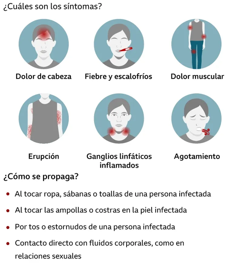 La enfermedad es causada por el virus de la viruela símica, perteneciente al mismo grupo de virus que la viruela, pero es mucho menos dañino. Los síntomas iniciales incluyen fiebre, dolores de cabeza, hinchazón, dolor de espalda y dolores musculares.