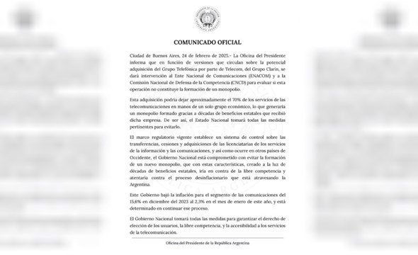 La Oficina del Presidente informa que en función de versiones que circulan sobre la potencial adquisición del Grupo Telefónica por parte de Telecom, del Grupo Clarín, se dará intervención al Ente Nacional de Comunicaciones (ENACOM) y a la Comisión Nacional de Defensa de la Competencia (CNCD) para evaluar si esta operación no constituye la formación de un monopolio.