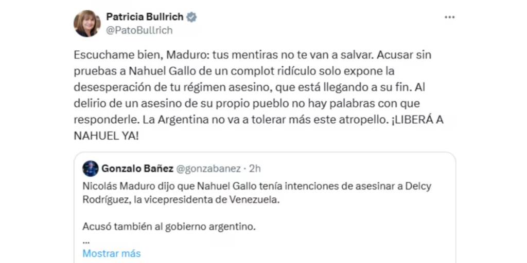 En esta misma línea, Bullrich manifestó en su cuenta de X (antes Twitter): “Acusar sin pruebas a Nahuel Gallo de un complot ridículo solo expone la desesperación de tu régimen asesino, que está llegando a su fin”.