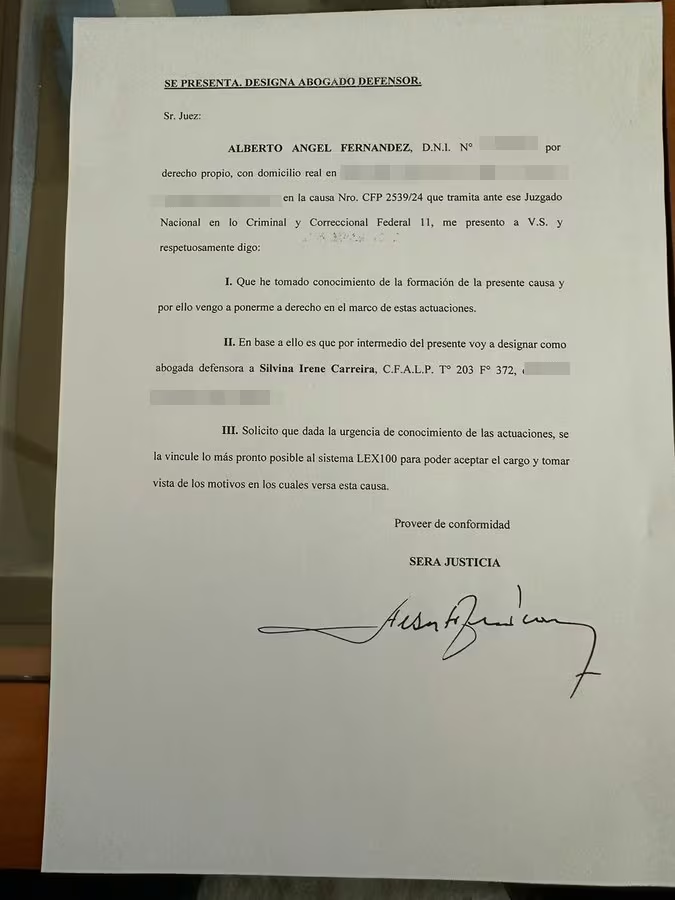Según consta en el documento que lleva la firma de Fernández, su abogada en la causa será desde ahora Silvina Carreira, penalista especializada en familia.