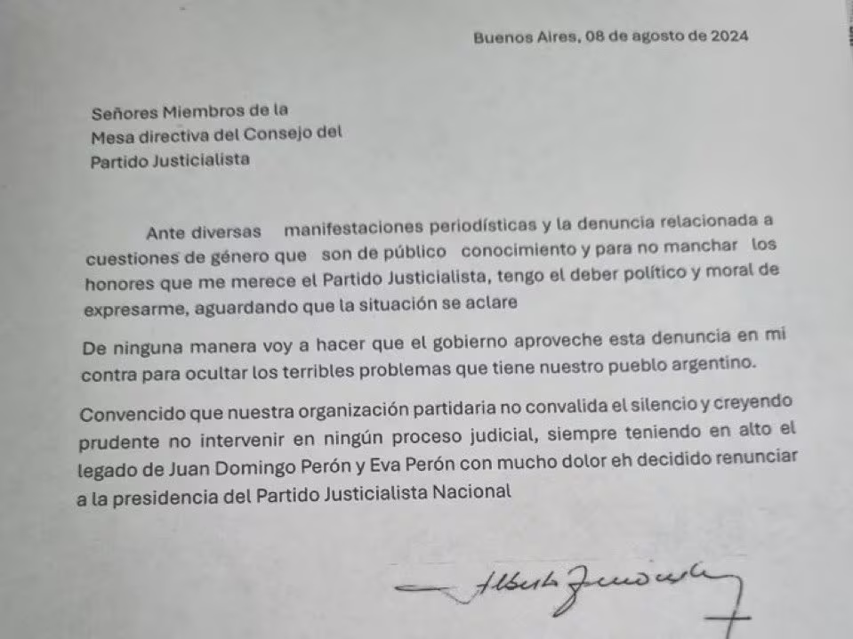“Convencido que nuestra organización partidaria no convalida el silencio y creyendo prudente no intervenir en ningún proceso judicial, siempre teniendo en alto el legado de Juan Domingo Perón y Eva Perón con mucho dolor eh decidido renunciar a la presidencia del Partido Justicialista Nacional”, concluye.