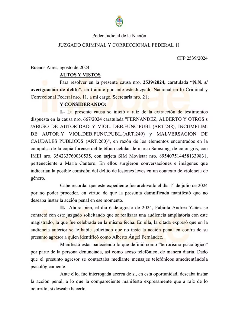 “El día 6 de agosto de 2024, Fabiola Andrea Yañez se contactó con el juzgado solicitando que se realizara una audiencia ampliatoria con el magistrado, la que fue celebrada en la misma fecha”, indicó la orden de restricción contra Fernández.