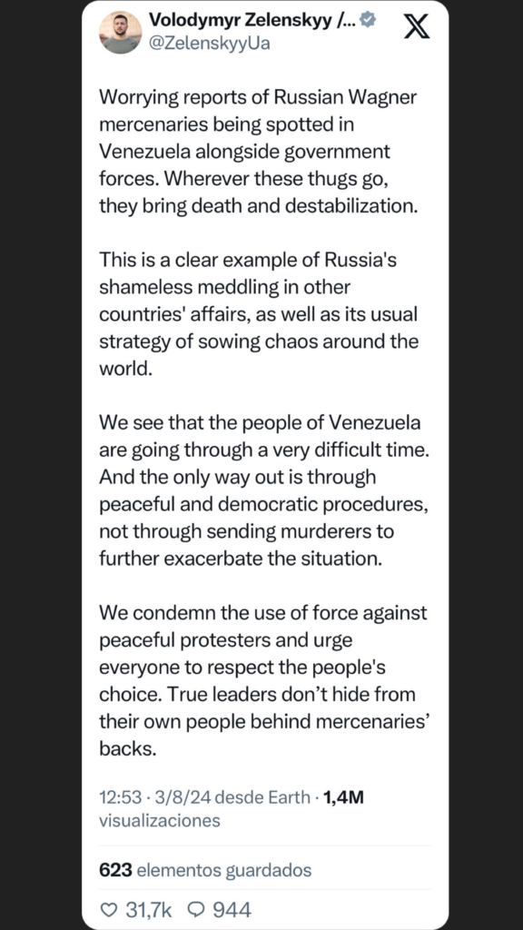 El presidente de Ucrania, Volodymyr Zelensky, denuncio que hay informes preocupantes sobre la aparición de mercenarios rusos Wagner en Venezuela junto con las fuerzas gubernamentales.